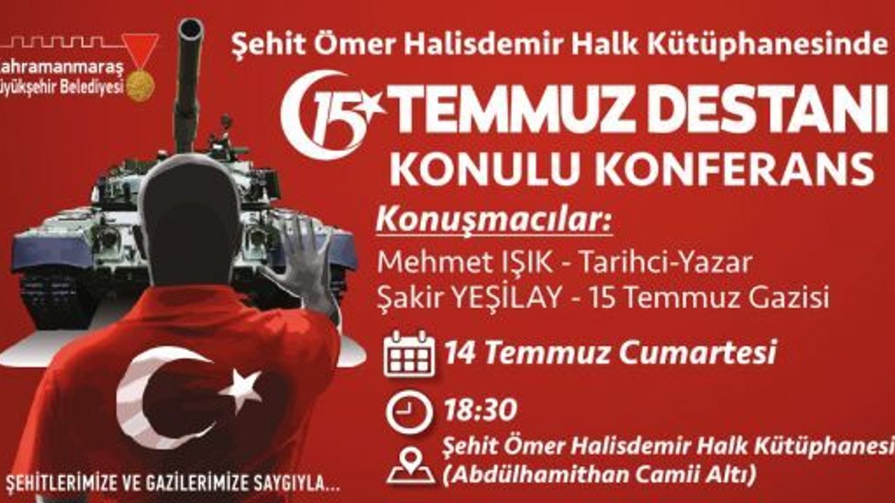 Kahramanmaraş Büyükşehir Belediyesi bünyesinde hizmet veren Şehit Ömer Halisdemir Halk Kütüphanesi’nde 15 Temmuz Destanı konulu bir konferans gerçekleştirilecek. Şehit Ömer Halisdemir Halk Kütüphanesi (Abdulhamidhan Camii altı)’nde 14 Temmuz 2018 Cumartesi günü saat 18.30’da gerçekleştirilecek 15 Temmuz Destanı konulu konferansa konuşmacı olarak Tarihçi Yazar Mehmet Işık ile 15 Temmuz Gazisi Şakir Yeşilay katılacak.