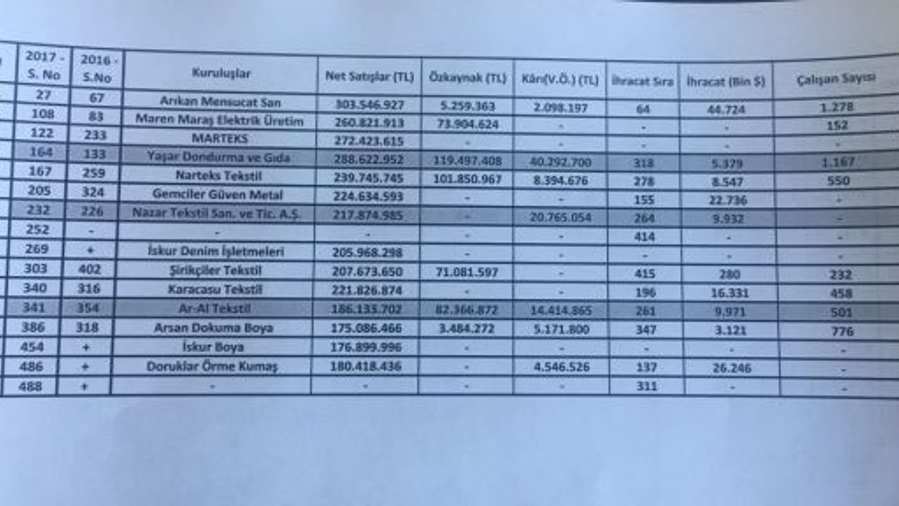 İSTANBUL SANAYİ ODASI “İLK 500 BÜYÜK SANAYİ KURULUŞU” 2017 YILI LİSTESİNDEKİ KAHRAMANMARAŞ ŞİRKETLERİ