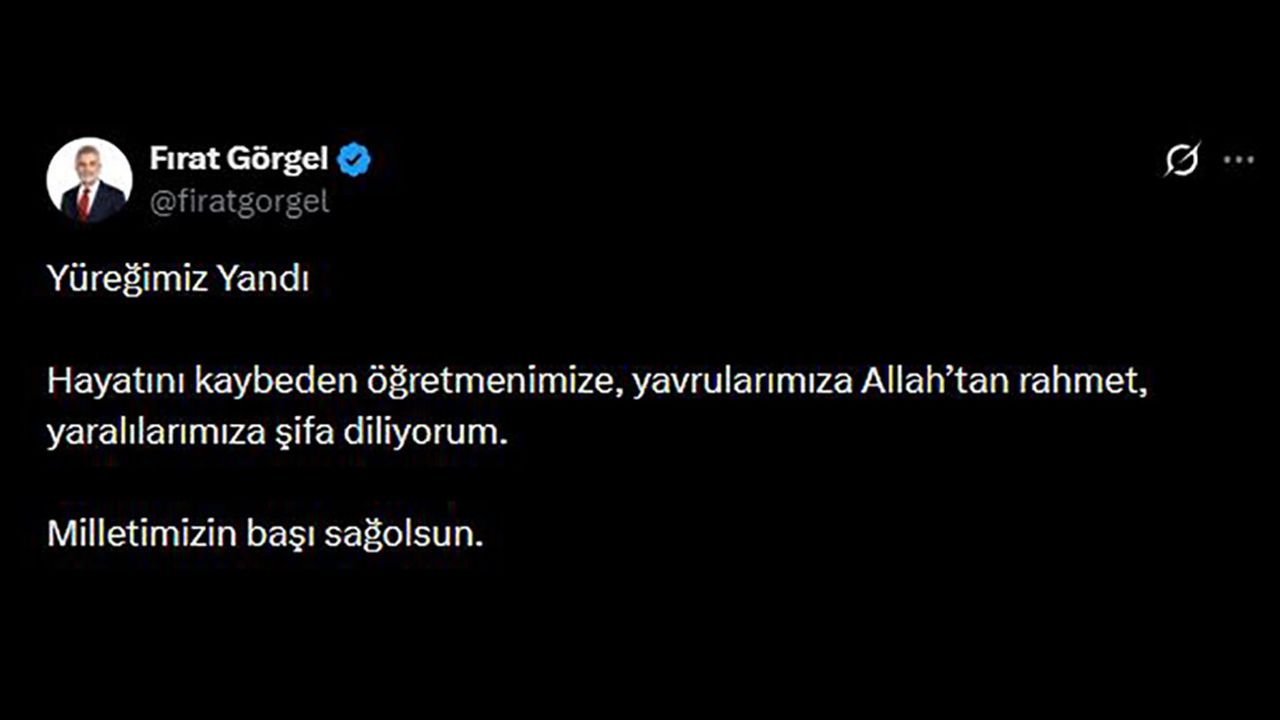 Kahramanmaraş’ın Onikişubat ilçesinde bir ortaokulda meydana gelen silahlı saldırı olayı sonrası başsağlığı mesajı yayımlayan Başkan Fırat Görgel, “Yüreğimiz yandı, milletimizin başı sağ olsun” dedi.