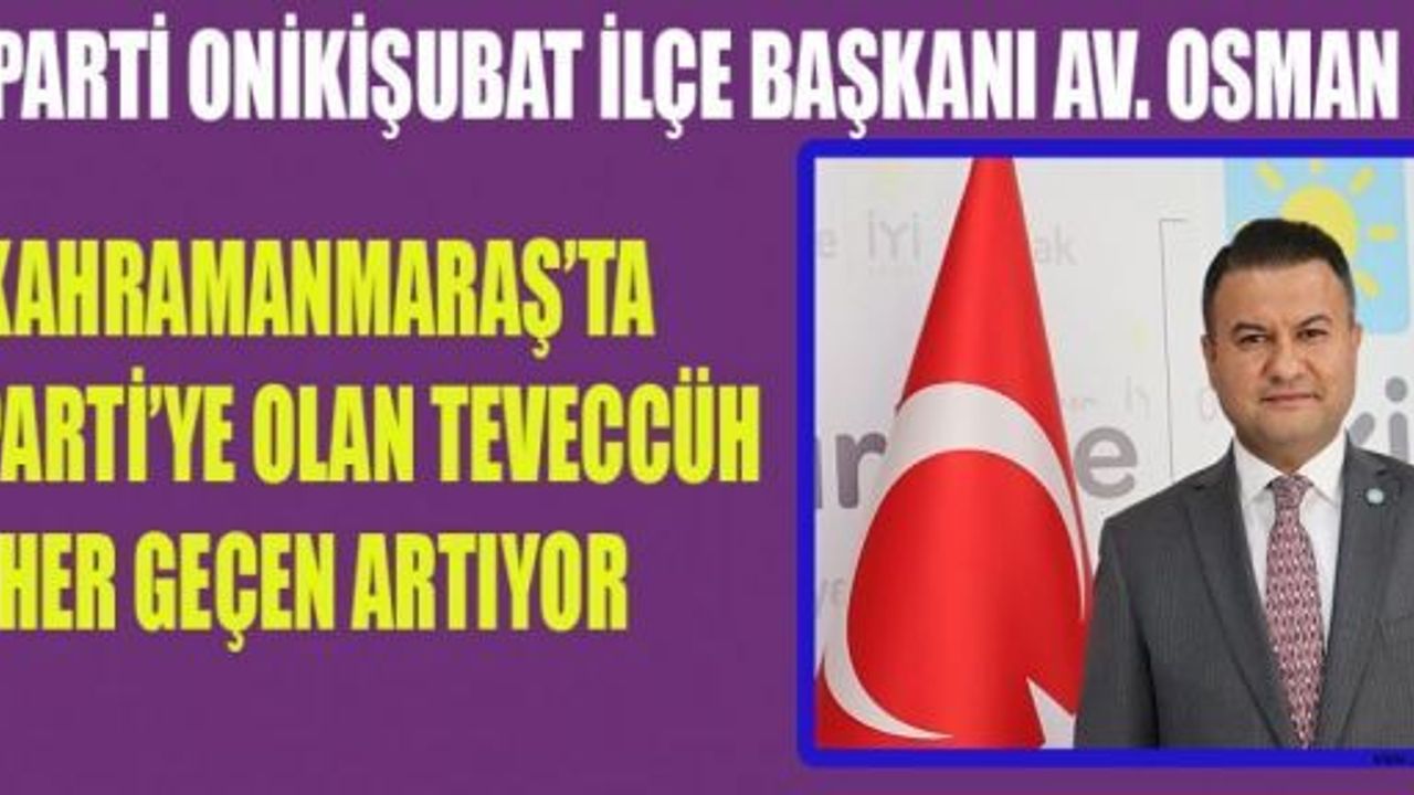 Başkan Osman Ay, “Kahramanmaraş’ta İYİ Parti’ye olan teveccüh her geçen artıyor. Partimize üye katılımı her geçen gün artıyor. Partimize Kahramanmaraş’ta çok güzel bir teveccüh var. Bu teveccühten oldukça mutluyuz. Bu da seçimlere daha iyi hazırlanmamız için güzel bir motivasyon oluyor.
