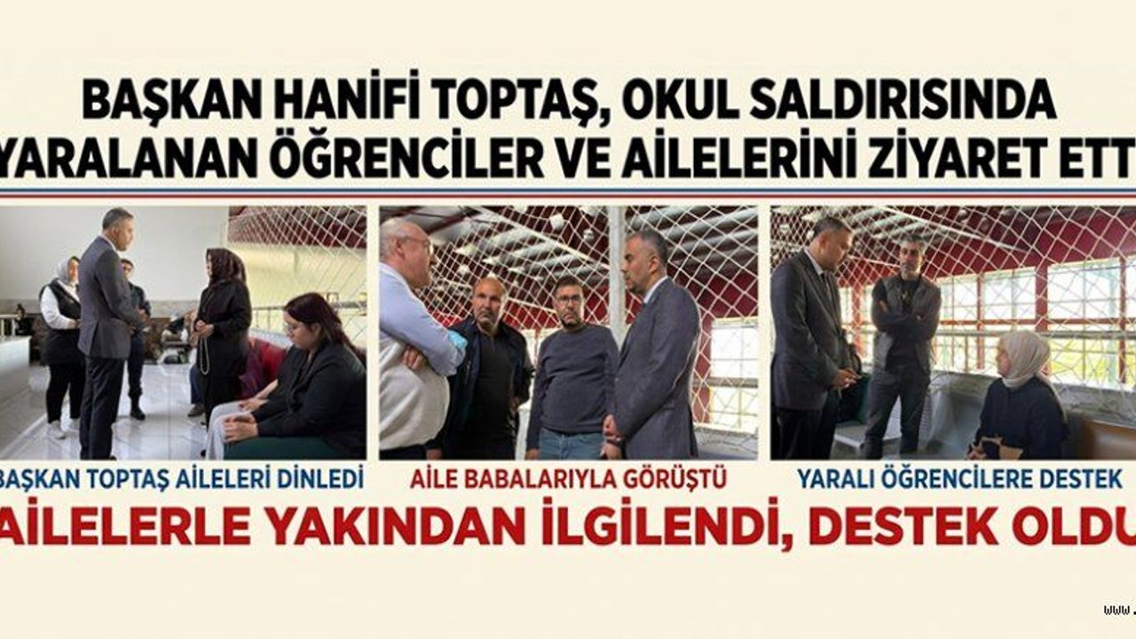 Ziyaret sırasında ailelerle de bir araya gelen Başkan Toptaş, bu zor süreçte yalnız olmadıklarını vurgulayarak, “Kelimelerin aslında kifayetsiz kaldığı maalesef acı bir olayla karşı karşıya kaldık. İlçemizde Aysel Çalık Ortaokulumuzda, burada maalesef menfur bir saldırıda Ayla öğretmenimizi ve sekiz yavrumuzu kaybettik. Öncelikle onlara Allah'tan rahmet diliyorum, mekânları cennet olsun inşallah diyorum.