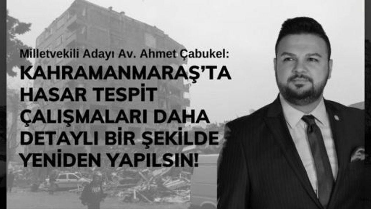 Kahramanmaraşlıların sorunlarıyla dertlenen ve bu yönüyle vatandaşların takdirini kazanan Milletvekili Adayı Av. Ahmet Çabukel, Kahramanmaraşlıların en çok şikayet ettiği hasar tespit çalışmalarındaki memnuniyetsizliği kamuoyunun gündemine taşıdı. Hasar tespit çalışmalarının gerekli zaman ayrılarak detaylı inceleme yapılamadığı için halktaki memnuniyetsizliğin üst düzeyde olduğunu belirten Çabukel, vatandaşın bu konudaki mağduriyetinin giderilmesi için yetkililere yeniden “tam denetim yapın” çağrısında bulundu.