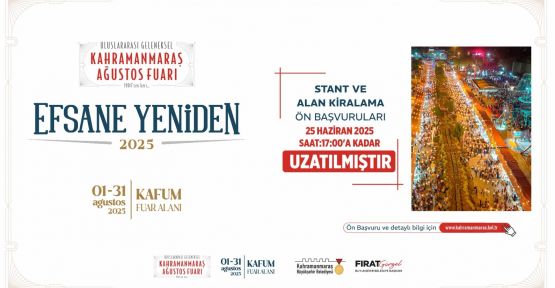 Kahramanmaraş Büyükşehir Belediyesi tarafından 1 – 31 Ağustos tarihleri arasından KAFUM’da düzenlenecek Uluslararası Geleneksel Ağustos Fuarı’nda yer almak isteyen esnaflar için stant ve alan kiralama ön başvuruları 25 Haziran Çarşamba günü saat 17.00’a kadar uzatıldı.