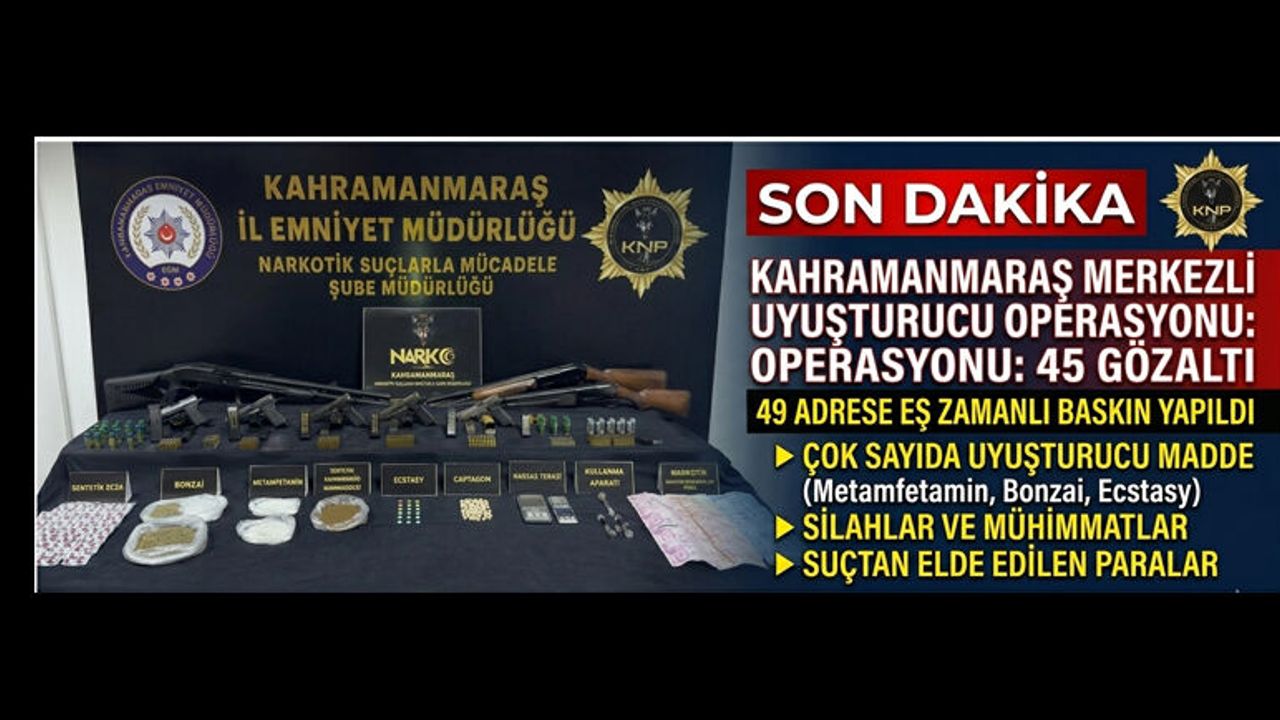 Kahramanmaraş Cumhuriyet Başsavcılığı tarafından yürütülen uyuşturucu madde ticaretine yönelik soruşturma kapsamında 5 ilde eş zamanlı operasyon düzenlendi. Operasyonda 45 şüpheli gözaltına alındı.