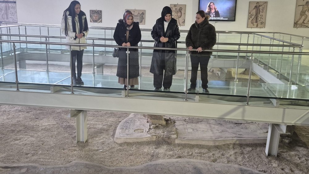 Tabi hayranlıkla izledik, hayranlıkla dinledik Safinaz Hanımefendiyi. Mozaiklerdeki tasvirlerde bitkisel ve geometrik motifler, günlük hayattan seçilmiş betimlemeler ve dönemin mimari yapısını gösteren kompozisyonların yer aldığını anlattı tek tek.