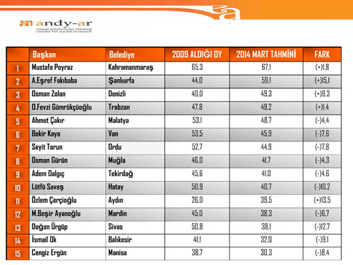 Raporda 15 il diğer iller kategorisinde olmak üzere toplam 31 il ve ilçe sonuçları sıralandı. Ankette cevap bulan sorulardan bazıları şu şekilde: "Mevcut belediye başkanları seçildikleri partiler aday gösterirse, bölgelerinde şu an itibarıyla halkın yüzde kaç oranı oy veririm diyor?, "2009 Resmi sonuçları ile 30 Mart 2014'de seçime girmeleri halinde oylarını artırabildiler mi?"