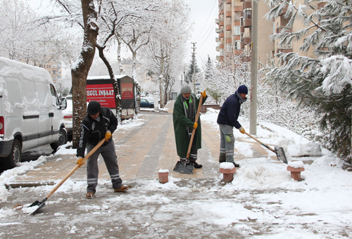 Kaldırımlar, refüjler ve yaya geçitleri de dahil olmak üzere her noktada temizleme çalışmaları devam ediyor. Bu kapsamda hususiyetle camiler, sağlık ocakları, hastaneler ve diğer kamu kuruluşları önlerinde bulunan kaldırımlar ve şehrin ana arterlerindeki kar kalıntıları buzlanma riskine binaen temizleniyor.