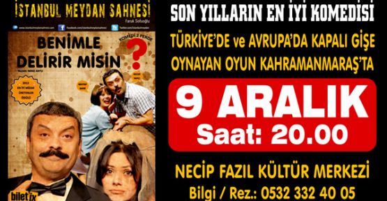 09.12.2013 Pazartesi günü Necip Fazıl Kültür Merkezi'nde sahnelenecek olan "Benimle Delirir Misin?", Tiyatro oyununu kaçırmayınız.