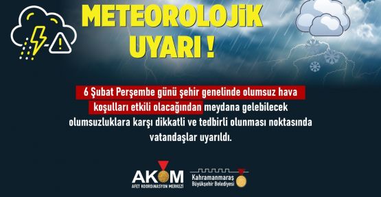 Büyükşehir Belediyesi Afet Koordinasyon Merkezi tarafından yapılan açıklamaya göre, 6 Şubat Perşembe günü şehir genelinde etkili olması beklenen kuvvetli rüzgâr, sağanak yağış, kar yağışı ve fırtına nedeniyle vatandaşların dikkatli ve tedbirli olması gerektiği bildirildi. Meteorolojik veriler doğrultusunda yapılan uyarıya göre, 6 Şubat Perşembe günü saat 00.00 itibarıyla başlayacak olumsuz hava koşullarının 7 Şubat Cuma günü sabah saatlerine kadar devam etmesi öngörülüyor.