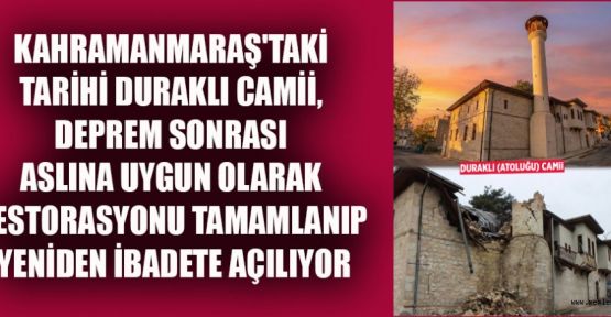 Büyükşehir Belediye Başkanı Fırat Görgel, Kahramanmaraş’ın tarihi ve kültürel mirasının yeniden ayağa kaldırılmasının önemine vurgu yaparak, “Bugün Kahramanmaraş’ımızın tarihi yapılarından biri olan Duraklı Camii’mizi yeniden ibadete açmanın mutluluğunu yaşıyoruz. Depremde hasar alan tarihi yapılarımızı inşallah bir bir ayağa kaldırmaya devam edeceğiz” ifadelerini kullandı.