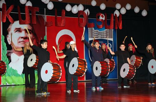 İzleyenlerin de katıldığı coşkulu bir atmosferde öğretmenler öğrencileriyle birlikte davul gösterisi yaptı.