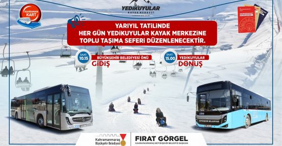 Büyükşehir Belediyesi, kış turizminin gözde adreslerinden Yedikuyular Kayak Merkezi’ne ulaşımı kolaylaştırmak için yarıyıl tatili boyunca otobüs seferleri düzenleyecek. Tatil boyunca her gün gerçekleştirilecek seferlerle, kayak tutkunları ve doğaseverler için çift yönlü ulaşım imkânı sağlanacak. Seferler, saat 10.00’da Büyükşehir Belediyesi önündeki otobüs durağından başlayacak.