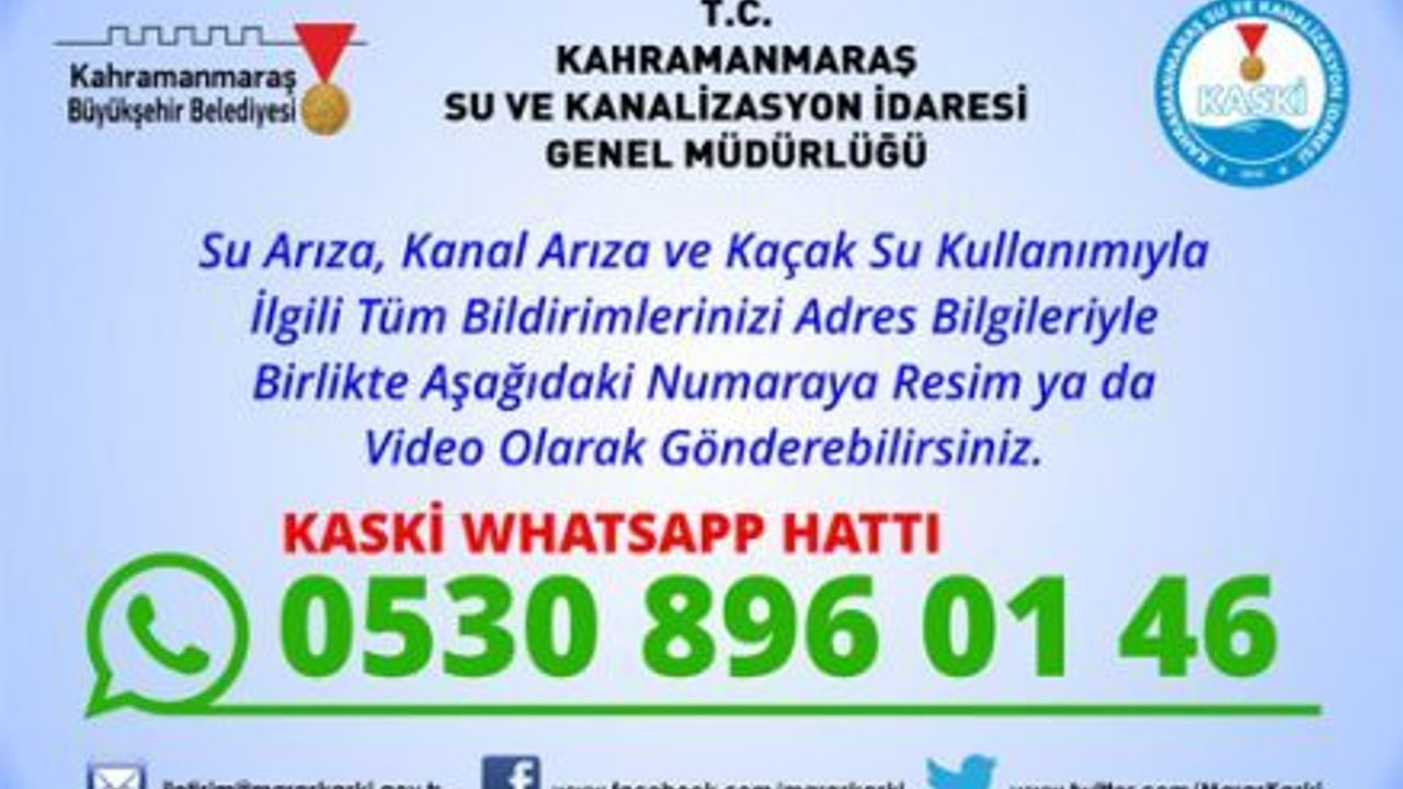 Kahramanmaraş Su ve Kanalizasyon İdaresi (KASKİ) vatandaşların 185 Çağrı Merkezine bildirimlerini görüntülü olarak yapabilmeleri için Whatsapp bilgi, talep ve ihbar hattı oluşturdu. Vatandaşlar KASKİ Genel Müdürlüğüne talep ve ihbarlarını ‘’0530 896 01 46’’ numaralı hat üzerinden yapabilecekler. KASKİ Genel Müdürü Mustafa Altunok yaptığı açıklamada: ‘’Genel Müdürlüğümüz kurulduğu günden itibaren vatandaş odaklı olarak hizmet vermeye devam etmektedir. Kahramanmaraş Büyükşehir Belediye Başkanımız Fatih Mehmet Erkoç’un önderliğinde vatandaş odaklı hizmetlerimiz gelişerek devam etmektedir. Bu kapsamda Kahramanmaraş il geneline vermiş olduğumuz hizmetlerle ilgili olarak vatandaşlarımız bize iletmek veya paylaşmak istediği bilgileri, resim veya video formatında 0530 896 01 46 numaralı whatsapp hattı üzerinden bize iletebilirler’’ diye konuştu. Altunok açıklamasının devamında; “Vatandaşların bildirimde bulunurken görüntülerle birlikte mutlaka adres ve açıklama bilgilerini göndermeleri gerektiğini söyledi. ‘’Bu numarayı rehberinize kaydedin. Bildirimlerinizi 0530 896 01 46 numarasını kaydedip Whatsapp ve diğer mesajlaşma uygulamaları üzerinden görüntülü olarak yapabilirsiniz’’ dedi.