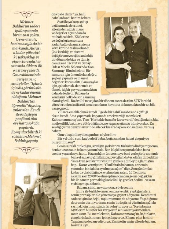 “Ne kadar gururlu olduğumu, ne onurlu bir görevle bu satırları yazdığımı Babam Mehmet Balduk’u tanıyan herkes bilir. Onu anlatırken bazı kelimeler, bazı övgüler kifayetsiz kalır. Nasıl bir baba, nasıl bir işadamı, nasıl bir patron, nasıl bir Stk lideri, nasıl bir dost olduğunu kendimizce anlatmaya çalıştık canım @Emre Balduk ile beraber.