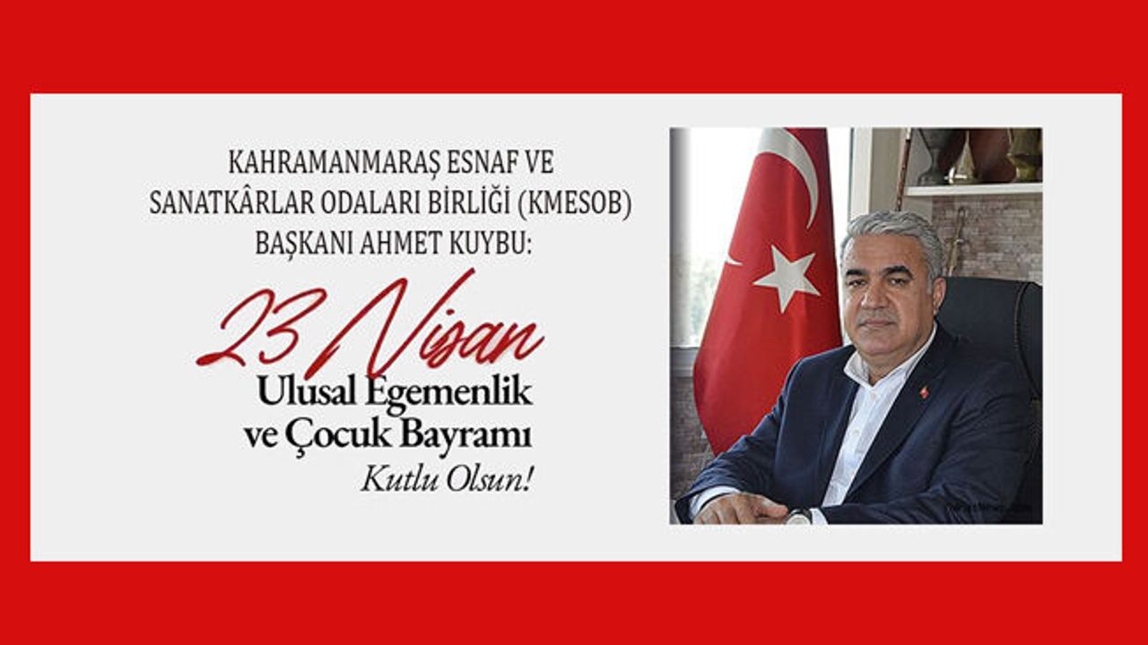 Kahramanmaraş Esnaf ve Sanatkârlar Odaları Birliği (KMESOB) Başkanı Ahmet Kuybu, 23 Nisan Ulusal Egemenlik ve Çocuk Bayramı dolayısıyla bir kutlama mesajı yayımladı. Başkan Kuybu, bu anlamlı günün bu yıl yaşanan acı olayların gölgesinde buruk bir şekilde idrak edildiğini ifade etti.