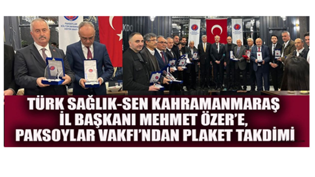 Türk Sağlık-Sen Kahramanmaraş İl Başkanı Mehmet Özer’e, Kahramanmaraş Paksoylar Kültür Dayanışma Eğitim Vakfı tarafından plaket takdim edildi.
