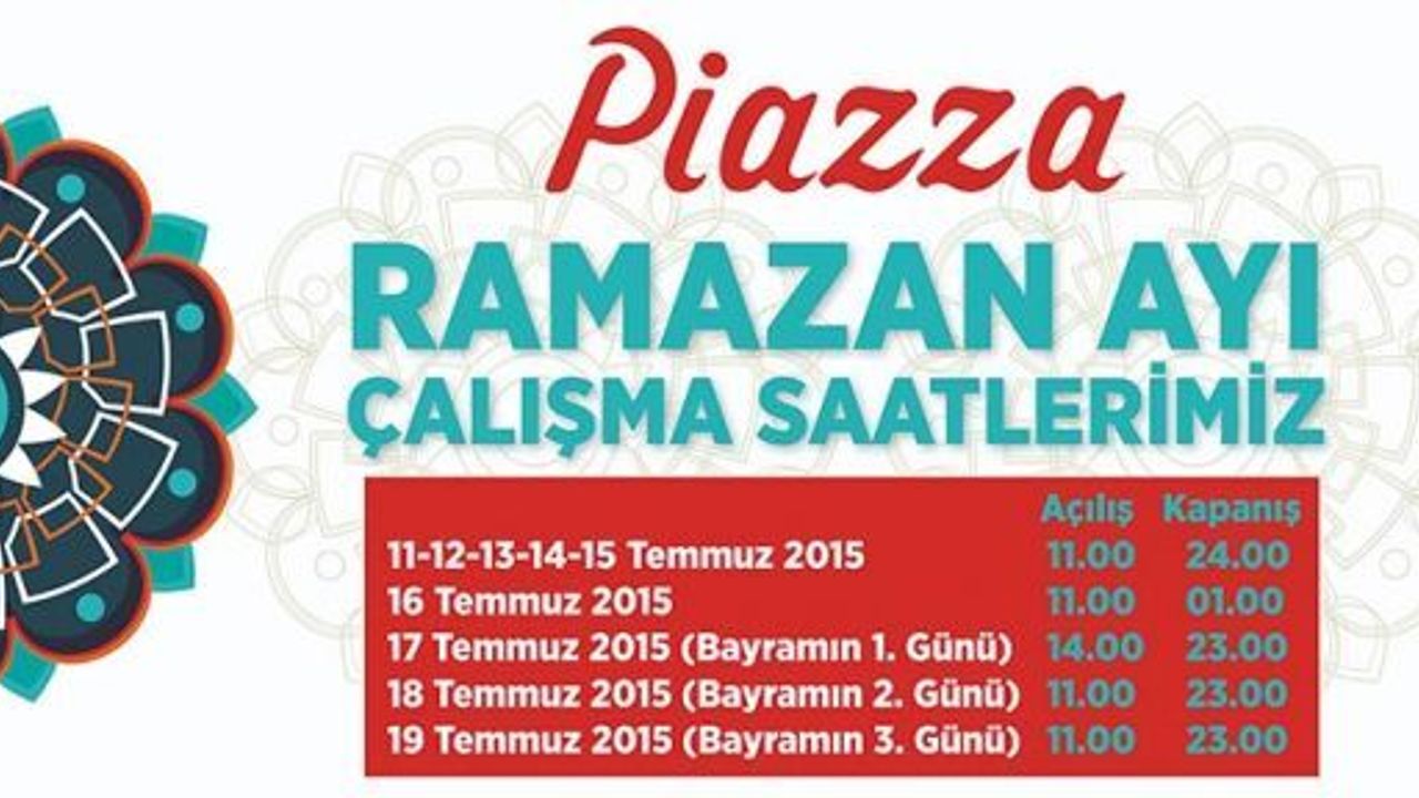 AVM, yeni çalışma saatleri uygulamasına göre; 12-13-14-15 Temmuz günleri saat 11.00’de açılıp 24.00’e kadar, 16 Temmuz Arife Günü ise 11.00'de açılıp gece 01.00'e kadar hizmet verecek. Piazza, Ramazan Bayramı'nın birinci günü 14.00'te, ikinci ve üçüncü günlerinde ise 11.00’de açılıp 23.00'e kadar ziyaretçilerini ağırlayacak.