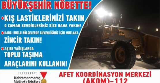 Kahramanmaraş Büyükşehir Belediyesi bünyesinde hizmet vermekte olan AKOM, meteorolojik uyarıların dikkate alınması gerektiğini ifade ederek: “ Yarın (18.01.2018 Perşembe) Kahramanmaraş çevrelerinde beklenen yağışların çok kuvvetli yer yer şiddetli sağanak (51-100 Kg/m2), kuzey ilçelerinde ise yoğun kar (20-50 cm) seklinde olacağı tahmin edildiğinden yaşanabilecek olumsuzluklara (ani sel, su baskını, yıldırım, kuvvetli rüzgar, buzlanma ve don olayı) karşı dikkatli ve tedbirli olunması gerekmektedir” denilerek bilgi verildi.