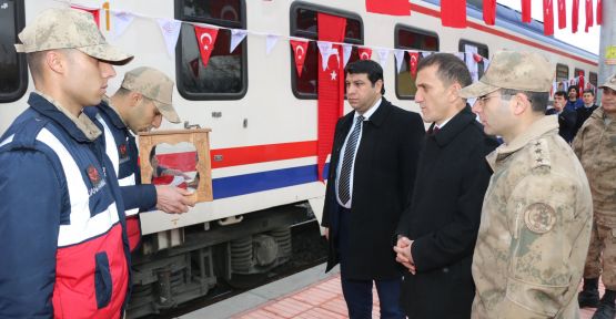 Tören ilk olarak tren ile tören alanına getirilen Türk Bayrağını askerler tarafından İlçe Kaymakamı Çağlayan Aydın, Belediye Başkan Vekili Adnan Pınarbaşı ve İlçe Garnizon Komutanı Abdulkadir Yağar teslim edilmesinin ardından bir dakikalık saygı duruşu ve İstiklal Marşının okunmasıyla başladı.