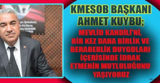 Esnaf Birlik Başkanı Başkanı Ahmet Kuybu mesajında şu görüşlere yer verdi: “Âlemlere Rahmet olarak gönderilen Hz. Muhammed (s.a.v)'in dünyaya teşriflerinin yıl dönümü olan Mevlid Kandili'ni, bir kez daha birlik ve beraberlik duyguları içerisinde idrak etmenin mutluluğuna erişmiş bulunmaktayız.