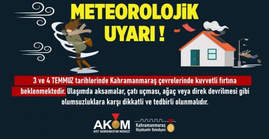 Büyükşehir Belediyesi Afet Koordinasyon Merkezi tarafından yapılan açıklamaya göre, 4 Temmuz Perşembe günü gece saatlerine kadar şehir genelinde kuvvetli rüzgâr ve zaman zaman fırtına etkili olacak. Büyükşehir Belediyesinden yapılan açıklamada, herhangi bir olumsuzluk yaşanmaması için gerekli tüm önlemlerin alındığı vurgulanarak, vatandaşların da tedbirli olması gerektiği belirtildi. Açıklamada, “Şehrimizde beklenen kuvvetli rüzgâr ve fırtına nedeniyle çatı uçması, ağaç ve direk devrilmesi, ulaşımda aksamalar gibi olumsuzluklar yaşanabilir.