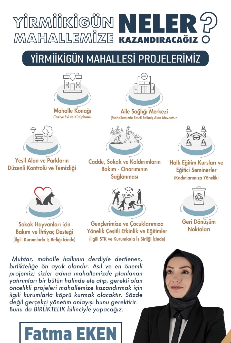 Yirmiikigün Mahallesi için hedeflerinden bahsederek 31 Mart’ta mahalle sakinlerinin desteğine talip olduğunu belirten Muhtar Adayı Fatma Eken, “Muhtar, mahalle halkının derdiyle dertlenen kişidir. Asıl ve en önemli projemiz, mahallemiz için planlanan yatırımları bir bütün halinde ele alıp mahallemize kazandırmak için ilgili kurumlarla köprü kurmak olacaktır. İçerisinde taziye evi ve kütüphane olan Mahalle Konağı ile Aile Sağlığı Merkezi’nin mahallemizde tescil edilmiş alanı mevcuttur.